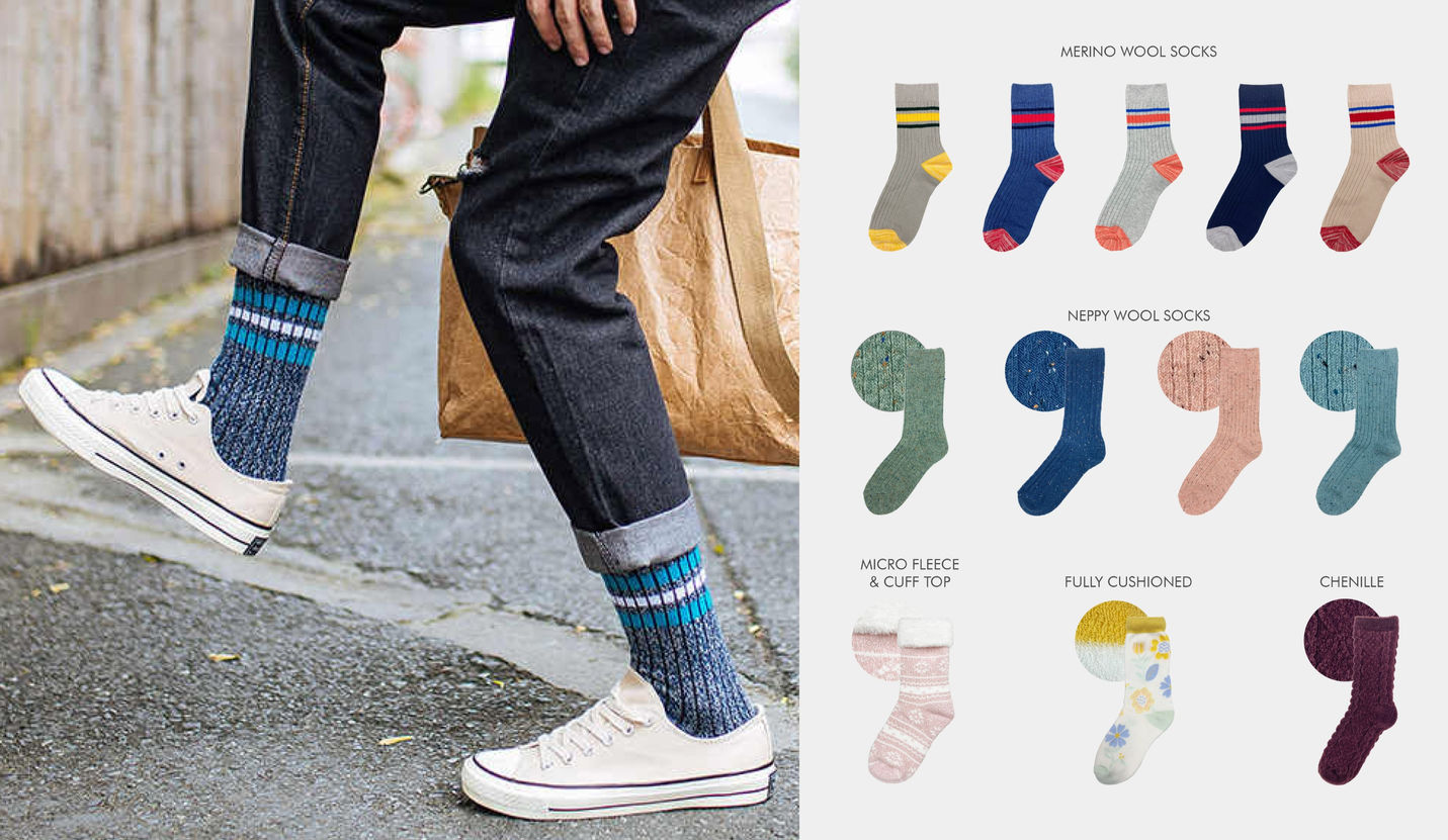 Majority of our men socks are suitable for everyday smart casual looks. They're easy to match, grab-and-go type of business socks. When it's around fall and winter, boots socks for men and fluffy socks for women are not to be missed. Who doesn't want to curl up and stay warm on cozy winter evenings?